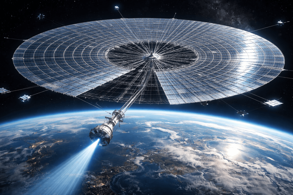 - Phase II: Infrastructure (2030–2038): Construction of orbital foundries and robotic assembly hubs in MEO. First 500 MW pilot beam to a remote rectenna.